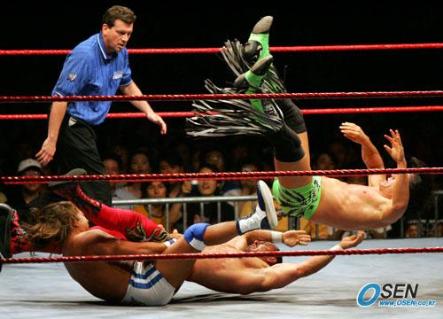 30일 저녁 서울 잠실체육관에서 벌어진 WWE 슈퍼쇼 후나키-차보 게레로-폴 런던(왼쪽으로부터)의 삼자 경기에서 세 명이 동시에 몸을 날리며 쓰러지고 있다. 이 경기에서는 폴 런던이 승리했다. /잠실체=주지영 기자 jj0jj0@osen.co.kr [Copyright ⓒ OSEN(www.osen.co.kr) 무단전재 및 재배포 금지]