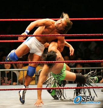 30일 저녁 서울 잠실체육관에서 벌어진 WWE 슈퍼쇼 후나키-폴 런던-차보 게레로의 3자 경기에서 차보 게레로가 쓰러진 사이 폴 런던(아래)이 후나키를 팔로 잡아 넘기고 있다. 이 경기에서 폴 런던이 승리를 거뒀다. /잠실체=주지영 기자 jj0jj0@osen.co.kr [Copyright ⓒ OSEN(www.osen.co.kr) 무단전재 및 재배포 금지]