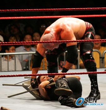 잠실실내체육관에서 30일 벌어진 WWE 슈퍼쇼 케인과 에지의 경기에서 케인이 경기 중 링으로 올라온 에지의 애인 리타의 목에 의자를 끼워 넣고 괴롭히고 있다. 이 경기에서 에지가 케인에게 서류가방으로 공격한 뒤 승리를 따냈다. /잠실체=주지영 기자 jj0jj0@osen.co.kr [Copyright ⓒ OSEN(www.osen.co.kr) 무단전재 및 재배포 금지]