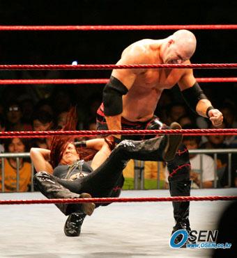 30일 서울 잠실체육관에서 열린 WWE 슈퍼쇼 케인과 에지의 경기에서 케인이 링 위로 난입한 리타의 머리를 잡고 공격하고 있다. 리타는 WWE 각본상 케인의 아내였으나 최근 배신, 에지의 애인으로 등장하고 있다. 이 경기에서 케인은 에지의 서류가방 공격을 받고 졌다. /잠실체=주지영 기자 jj0jj0@osen.co.kr [Copyright ⓒ OSEN(www.osen.co.kr) 무단전재 및 재배포 금지]