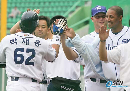 1일 문학경기장에서 벌어진 sk 와이번스와 두산 베어스의 경기 1회말 선두 타자로 나온 박재홍이 11연승을 기록중인 박명환으로 부터 가운데 담장을 넘어가는 솔로 홈런을 쳐내고 새용병 크루즈의 환영을 받고 있다. 박재홍은 이 홈런 한방으로 박명환의 12연승 도전과 209⅔이닝 무피홈런 기록을 중단 시켰다./인천=손용호기자spjj@osen.co.kr [Copyright ⓒ OSEN(www.osen.co.kr) 무단전재 및 재배포 금지]