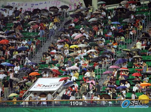 2일 LG 트윈스와 기아타이거즈 잠실경기에서 비가 조금씩 내리자 관중들이 우산을 쓰고 경기를 관전하고있다. 다행스럽게도 비는 금방 멈췄다. /잠실=주지영 기자 jj0jj0@osen.co.kr [Copyright ⓒ OSEN(www.osen.co.kr) 무단전재 및 재배포 금지]