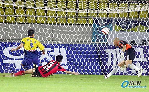 3일 성남 제2종합운동장에서 벌어진 성남 일화와 FC 서울의 경기 후반 성남의 김도훈(왼쪽)이 이성남이 만들어준 노마크 찬스에서 슛한 볼이 골인될 듯하더니 크로스바를 넘어가고 있다. 김도훈은 이성남이 만들어준 두 번의 노마크 찬스를 놓쳐 김현석(은퇴, 110골)의 역대 개인 통산 최다골 기록과 타이를 이룰 수 있는 기회를 무산시켰다./성남=손용호 기자 spjj@osen.co.kr [Copyright ⓒ OSEN(www.osen.co.kr) 무단전재 및 재배포 금지]