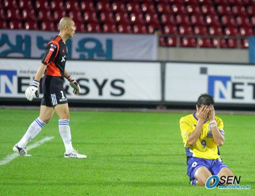 3일 성남 제2종합운동장에서 벌어진 성남 일화와 FC 서울의 경기 후반 성남의 김도훈이 노마크 찬스에서 득점에 실패한 뒤 그라운드에 무릎을 꿇고 아쉬워하고 있다. /성남=주지영 기자 jj0jj0@osen.co.kr [Copyright ⓒ OSEN(www.osen.co.kr) 무단전재 및 재배포 금지]