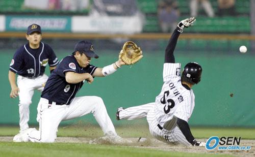 5일 LG 트윈스와 두산 베어스의 잠실 경기 LG의 5회말 1사 1루 클리어 타석 때 1루 주자 이대형이 두산 두 번째 투수 금민철의 견제구에 걸리자 2루로 뛰어 세이프되고 있다. 두산 1루수 장원진이 던진 공이 이대형의 등에 맞는 바람에 2루수 나주환은 볼을 받지 못했고 장원진의 실책으로 기록됐다./잠실= 주지영 기자 jj0jj0@osen.co.kr [Copyright ⓒ OSEN(www.osen.co.kr) 무단전재 및 재배포 금지]