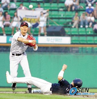 6일 LG 트윈스와 두산 베어스의 잠실경기 두산의 5회초 1사 1루 김재호의 3루수 땅볼 때 나주환이 슬라이딩으로 2루에 들어가며 송구를 방해하려 했으나 늦었다. LG 2루수 이종렬이 1루로 송구, 병살 처리하고 있다./잠실=주지영 기자jj0jj0@osem.co.kr [Copyright ⓒ OSEN(www.osen.co.kr) 무단전재 및 재배포 금지]