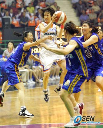 신한은행배 2005 여자프로농구(WKBL) 여름리그가 7일 서울 장충체육관에서 개막돼 78일간의 열전에 돌입했다. 개막전에서 춘천 우리은행의 김영옥(가운데)가 안산 신한은행 전주원(왼쪽) 등의 마크 사이에서 점프, 패스할 곳을 찾고 있다./장충체=주지영 기자 jj0jj0@osen.co.kr [Copyright ⓒ OSEN(www.osen.co.kr) 무단전재 및 재배포 금지]