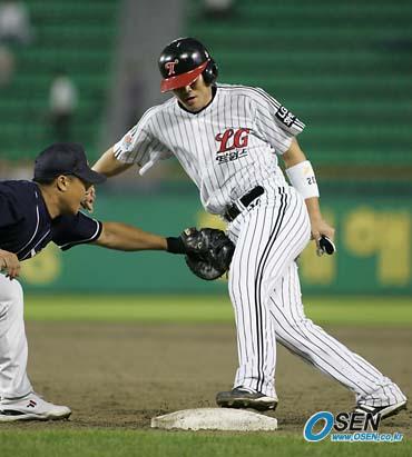 7일 잠실 구장에서 LG 트윈스와 두산 베어스의 경기가 비가 간간이 내리는 가운데 열렸다. 4회말 선두 타자로 나와 안타로 출루한 LG 최동수가 두산 포수 홍성흔의 견제구에 걸려 1루수 장원진에게 태그 아웃되고 있다. 사진상으로도 최동수의 발이 베이스에 닿기 직전에 다리에 태그되는 모습이 확연하다./잠실=손용호 기자spjj@osen.co.kr [Copyright ⓒ OSEN(www.osen.co.kr) 무단전재 및 재배포 금지]