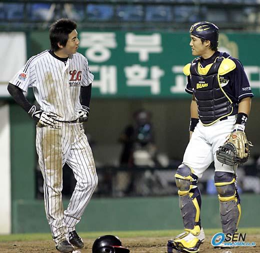 7일 비가 간간이 내리는 가운데 벌어진 잠실 라이벌 LG 트윈스와 두산 베어스의 경기서 LG가 7-4로 역전승을 거둬 잠실 3연전을 모두 승리하며 6연승을 이어갔다. 8회말 1사 3루서 김정민의 1루 땅볼 때 홈을 파고들다 아웃된 LG 이대형이 두산 포수 홍성흔에게 세이프가 아니냐고 물어 보고 있다./잠실=손용호 기자 spjj@osen.co.kr [Copyright ⓒ OSEN(www.osen.co.kr) 무단전재 및 재배포 금지]
