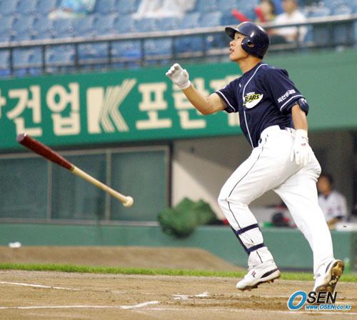 7일 비가 간간이 내리는 가운데 열린 LG 트윈스와 두산 베어스의 잠실경기 1회초 2사 후 두산의 강봉규가 선제 솔로 홈런을 날린 뒤 타구의 궤적을 바라보며 1루로 스타트하고 있다./잠실=주지영 기자 jj0jj0@osen.co.kr [Copyright ⓒ OSEN(www.osen.co.kr) 무단전재 및 재배포 금지]