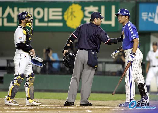 8일 잠실구장에서 벌어진 두산 베어스와 삼성 라이온즈의 경기 삼성의 6회초 박한이 타석 때 두산 투수 조현근의 볼이 머리쪽으로 날아왔다. 이에 화가 난 박한이와 포수 용덕한간에 언쟁이 붙자 이영재 구심이 말리고 있다. 순간 양 팀 선수들이 그라운드로 몰려 나와 경기가 잠시 중단됐다./잠실=손용호 기자spjj@osen.co.kr [Copyright ⓒ OSEN(www.osen.co.kr) 무단전재 및 재배포 금지]