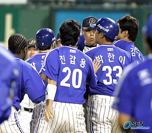 8일 잠실구장에서 벌어진 두산 베어스와 삼성 라이온즈의 경기 삼성의 6회초 박한이 타석 때 두산 투수 조현근의 볼이 머리쪽으로 날아왔다. 이에 화가 난 박한이와 두산 포수 용덕한과 시비가 붙자 양 팀 선수들이 그라운드로 몰려 나와 약간의 실랑이를 벌이고 있다./잠실=손용호 기자 spjj@osen.co.kr [Copyright ⓒ OSEN(www.osen.co.kr) 무단전재 및 재배포 금지]