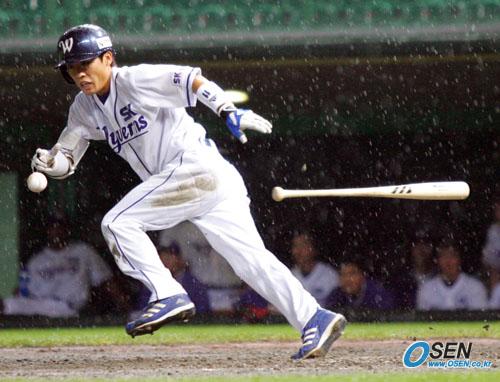 8일 인천 문학 구장에서 벌어진 SK 와이번스와 LG 트윈스의 경기 SK의 5회말 2사 1,2루서 조동화가 기습 번트를 댄 뒤 잽싸게 1루로 스타트하고 있다. 그러나 간발의 차이로 아웃되고 말았다./인천= 주지영 기자 jj0jj0@osen.co.kr [Copyright ⓒ OSEN(www.osen.co.kr) 무단전재 및 재배포 금지]
