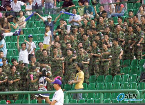 8일 SK 와이번스와 LG 트윈스의 경기를 관전하기 위해 단체로 인천 문학구장을 찾은 군인들이 SK 치어리더의 동작에 따라 춤을 추며 응원하고 있다./인천=주지영 기자 jj0jj0@osen.co.kr [Copyright ⓒ OSEN(www.osen.co.kr) 무단전재 및 재배포 금지]
