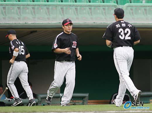 9일 문학 구장에서 벌어진 SK 와이번스와 LG 트윈스전. 2회말 SK 공격 1사 만루에서 이진영이 2타점 적시타를 터뜨려 0-8로 크게 리드를 당하게 되자 LG 벤치가 포수 김정민을 최승환으로, 2루수 이종렬(왼쪽)을 권용관으로, 1루수 최동수를 박병호(가운데)로 동시에 교체하고 있다. 권용관은 유격수로 들어가고 한규식이 유격수에서 2루수로 이동했다. /인천=손용호 기자 spjj@osen.co.kr [Copyright ⓒ OSEN(www.osen.co.kr) 무단전재 및 재배포 금지]