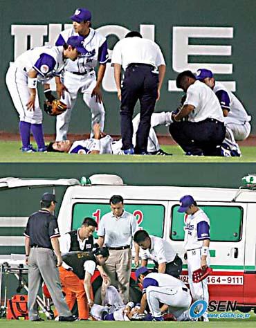 9일 문학 구장에서 벌어진 SK 와이번스와 LG 트윈스의 경기 LG의 5회초 1사 후 이병규의 플라이 타구를 서로 잡으려던 SK 좌익수 조동화와 중견수 김강민이 심하게 충돌, 그라운드에 쓰러져 있다. 왼 발목에 통증을 호소한 조동화(위 사진)와 쇄골을 다친 김강민(아래 사진)은 곧바로 병원으로 실려가 정밀 진단을 받은 결과 김강민은 쇄골이 골절됐고 조동화는 타박상인 것으로 판명됐다./인천=손용호 기자 spjj@osen.co.kr [Copyright ⓒ OSEN(www.osen.co.kr) 무단전재 및 재배포 금지]