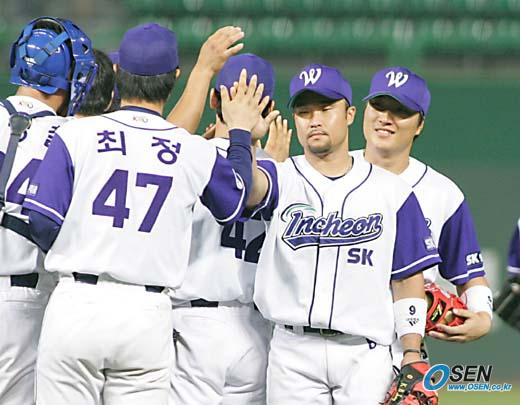 9일 문학 구장에서 벌어진 SK 와이번스와 LG 트윈스의 경기에서 이진영(오른쪽)이 혼자 5타점을 기록하고 선발 투수 고효준이 5이닝을 2피안타 11탈삼진 1실점으로 막은 SK가 10-1로 대승을 거두며 LG와 4위 자리를 바꿨다. 경기 후 SK 선수들이 마운드에서 하이파이브를 나누고 있다./인천=손용호 기자 spjj@osen.co.kr [Copyright ⓒ OSEN(www.osen.co.kr) 무단전재 및 재배포 금지]