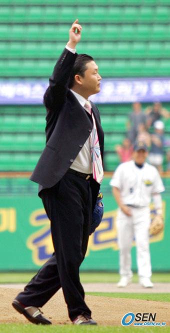 10일 두산 베어스와 삼성 라이온즈의 잠실경기에 앞서 인기 가수 싸이가 시구를 하기 위해 그라운드로 나오면서 관중들을 향해 인사하고 있다./잠실=주지영 기자 jj0jj0@osen.co.kr [Copyright ⓒ OSEN(www.osen.co.kr) 무단전재 및 재배포 금지]