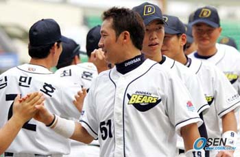 경기 전 김경문 감독은 "박명환 이혜천을 빼곤 투수들을 모두 털어넣겠다"며 '벌떼 작전'을 암시했다. 연패 탈출의 강력한 의지는 벤치에서 마운드로, 마운드에서 타자들에게로 전달됐고 연패 탈출로 이어졌다. 두산이 투수 엔트리 11명 중 6명을 투입하는 총력전으로 선두 삼성을 꺾고 장맛비보다 지긋지긋한 8연패를 끊었다. 10일 잠실구장에서 벌어진 삼성PAVV 2005 프로야구 삼성과 시즌 11차전에서 두산은 1회말 첫 공격에서 집중 5안타로 3점을 뽑은 뒤 한 박자 빠른 투수 교체로 삼성의 추격을 뿌리쳐 3-0으로 승리했다. 두산은 지난달 28일 잠실 롯데전 이후 꼭 2주만에 승리를 맛보며 삼성과 승차를 2.5게임으로 줄였다. 쫓아오지 않아도 쫓기는 마음의 두산을 구한 건 1회말 최경환의 선제 적시타였다. 톱타자 전상렬의 좌전안타와 장원진의 내야안타로 만든 무사 1,2루에서 최경환이 삼성 선발 권오준의 4구째를 잡아당겨 우중간을 가르는 2타점 3루타를 터뜨렸다. 계속된 1사 3루에서 홍성흔이 우전 적시타로 최경환까지 불러들였다. 연패에 허덕이는 동안 좀처럼 얻지 못했던 선취점을 두산은 야수들의 호수비와 김경문 감독의 적극적인 투수 교체로 지켜냈다. 1회초 삼성 첫 타자 박한이의 강습 타구를 유격수 손시헌이 재치있는 수비로 막아냈고,5회엔 김한수의 안타성 타구를 중견수 전상렬이 다이빙 캐치로 잡아냈다. 김경문 감독은 3-0으로 앞선 4회초 선발 김명제가 1사 후 양준혁에게 2루타를 맞자 곧바로 김성배로 교체하는 승부수를 던졌다. 불을 끈 김성배가 6회 주자를 내보내자 이날 기아로 트레이드가 확정된 전병두까지 원포인트로 투입하는 등 6명의 투수를 쏟아붓는 총력전을 펼쳤다. 반면 삼성 타자들은 몇번 안되는 득점 기회를 후속타 불발로 모두 날렸다. 2회 무사 1루에서 김한수가 2루앞 병살타를 쳤고 3회엔 역시 무사 1루에서 조동찬이 2루 앞 라인드라이브로 1루 주자 진갑용과 더블아웃됐다. 6회엔 1사후 박한이와 박종호가 볼넷과 몸에 맞는 공으로 1사 1,2루를 만들었지만 중심타선인 양준혁과 심정수가 바뀐 투수 이재우에게 연속 헛스윙 삼진 당해 결정적 기회를 놓쳤다. 선발 김명제에 이어 2이닝을 무안타 무실점을 막은 김성배가 승리(4승)를 안았고 8회 2사부터 1⅔이닝을 1피안타 2탈삼진 무실점으로 막은 정재훈이 세이브를 따내 8개 구단 소방수중 가장 먼저 20세이브 고지에 올랐다. 삼성은 3연승 끝. 마무리에서 선발로 전환, 올 시즌 처음으로 선발 등판한 권오준은 6이닝 7피안타 무사사구 4탈삼진 3실점 호투에도 패전 투수가 됐다. 시즌 첫 패(1승 17세이브). 양준혁은 4회 2루타를 날려 한국 프로야구 첫 개인 통산 350 2루타를 기록했다. 이종민 기자 mini@osen.co.kr [Copyright ⓒ OSEN(www.osen.co.kr) 무단전재 및 재배포 금지]
