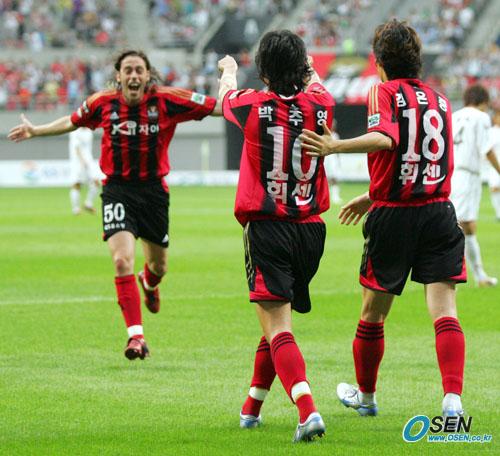 10일 서울 상암 월드컵경기장에서 벌어진 FC 서울과 포항 스틸러스의 경기 전반 서울의 박주영이 페널티 에어리어 안 오른쪽서 오른발 슛으로 선제골을 터뜨리고 김은중과 함께 돌아 나오자 어시스트를 한 히칼도가 달려오며 기뻐하고 있다./상암=주지영 기자 jj0jj0@osen.co.kr [Copyright ⓒ OSEN(www.osen.co.kr) 무단전재 및 재배포 금지]