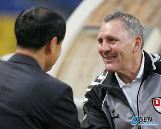 부산 아이파크가 10일 부산 아시아드 주경기장에서 벌어진 대전 시티즌과의 전기리그 마지막 경기서 1-1로 비겨 전기리그 우승을 차지했다. 경기 후 최윤겸 대전 감독(왼쪽)이 포터필드 감독에게 축하 악수를 건네고 있다./부산=손용호 기자 spjj@osen.co.kr [Copyright ⓒ OSEN(www.osen.co.kr) 무단전재 및 재배포 금지]