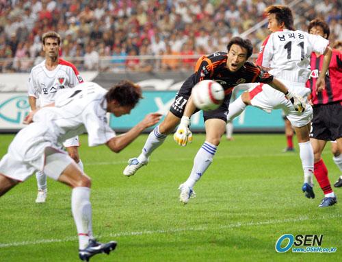 10일 서울 상암 월드컵경기장에서 벌어진 FC 서울과 포항 스틸러스의 경기 후반 0-3으로 뒤지던 포항의 이정호(왼쪽)가 빈 골문 안으로 헤딩슛, 한 골을 만회하고 있다. 골문을 비우고 나왔다 펀칭에 실패한 서울 골키퍼 박동석은 구경만 할 수밖에 없었다./상암=주지영 기자 jj0jj0@osen.co [Copyright ⓒ OSEN(www.osen.co.kr) 무단전재 및 재배포 금지]