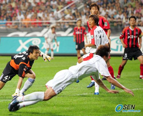 10일 서울 상암 월드컵경기장에서 벌어진 FC 서울과 포항 스틸러스의 경기 후반 0-3으로 뒤지고 있던 포항의 이정호(오른쪽)가 골키퍼가 없는 골문 안으로 노마크 헤딩슛, 한 골을 만회하고 있다. 서울 골키퍼 박동석(왼쪽)과 수비수들이 망연자실한 표정으로 뒤를 바라보고 있다./상암=주지영 기자 jj0jj0@osen.co [Copyright ⓒ OSEN(www.osen.co.kr) 무단전재 및 재배포 금지]
