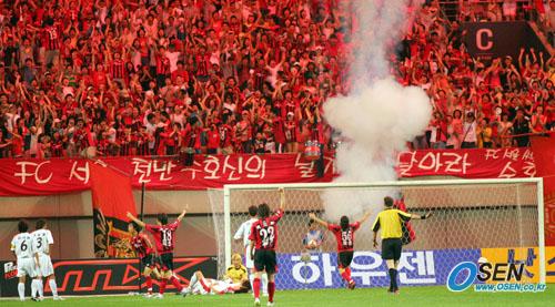 10일 서울 상암 월드컵경기장에서 벌어진 FC 서울과 포항 스틸러스의 경기 후반 박주영이 자신의 2번째 골을 터뜨려 3-0이 되자 포항 골문 뒤에서 축포가 터지고 있다./상암=주지영 기자 jj0jj0@osen.co [Copyright ⓒ OSEN(www.osen.co.kr) 무단전재 및 재배포 금지]