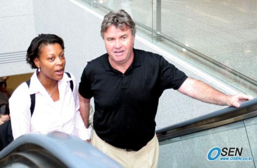 오는 15일 개막되는 피스컵 2005 코리아 대회에 참가하는 네덜란드 PSV 아인트호벤의 히딩크 감독과 선수들이 12일 오후 인천공항을 통해 입국했다. 히딩크 감독이 동반한 애인 엘리자베스와 함께 에스컬레이터를 통해 기자회견장으로 이동하고 있다./인천공항=손용호 기자 spjj@osen.co.kr [Copyright ⓒ OSEN(www.osen.co.kr) 무단전재 및 재배포 금지]