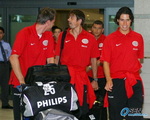 오는 15일 개막되는 피스컵 2005 코리아 대회에 참가하는 네덜란드 PSV 아인트호벤의 히딩크 감독과 선수들이 12일 오후 인천공항을 통해 입국했다. 선수들이 붉은색 아인트호벤 티셔츠 차림으로 입국장을 나서고 있다. /인천공항=주지영 기자 jj0jj0@osen.co.kr [Copyright ⓒ OSEN(www.osen.co.kr) 무단전재 및 재배포 금지]