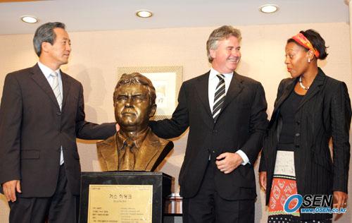 오는 15일 개막되는 피스컵 2005 코리아 대회에 참가하기 위해 지난 12일 내한한 히딩크 아인트호벤 감독이 13일 정몽준 대한축구협회장(왼쪽)과 서울 소공동 롯데호텔에서 오찬을 함께 했다. 축구 명예의 전당에 전시될 히딩크의 흉상을 히딩크 감독의 애인 엘리자베스가 바라보고 정말 똑같다며 활짝 웃고 있다./주지영 기자jj0jj0@osen.co.kr [Copyright ⓒ OSEN(www.osen.co.kr) 무단전재 및 재배포 금지]