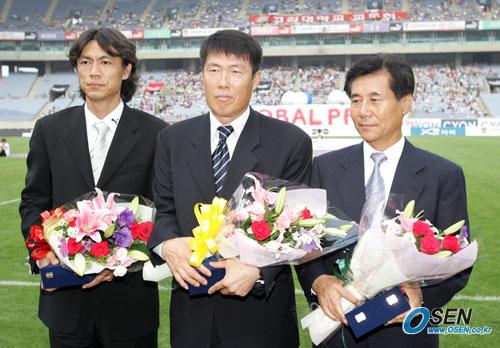 13일 인천 문학구장에서 열린 PSV 아인트호벤과 고려대 OB 프로올스타의 친선 경기에 앞서 고려대 출신인 김정남 울산 현대 감독, 차범근 수원 삼성 감독, 홍명보 대한축구협회 이사(오른쪽으로부터)가 나란히 기념패와 꽃다발을 받은 뒤 나란히 서 있다. 김 감독은 60년대, 차 감독은 70년대, 홍 이사는 80년대 대학 무대를 주름잡았다./인천=손용호 기자 spjj@osen.co.kr [Copyright ⓒ OSEN(www.osen.co.kr) 무단전재 및 재배포 금지]