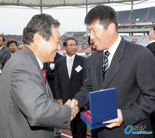 고려대 개교 100주년 기념으로 13일 인천 문학구장에서 열린 PSV 아인트호벤과 고려대 OB 프로올스타의 친선 경기에 앞서 차범근 수원 삼성 감독이 '자랑스러운 고대 체육인상'을 받고 있다./인천=손용호 기자 spjj@osen.co.kr [Copyright ⓒ OSEN(www.osen.co.kr) 무단전재 및 재배포 금지]