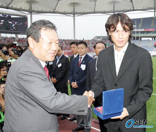 고려대 개교 100주년 기념으로 13일 인천 문학구장에서 열린 PSV 아인트호벤과 고려대 OB 프로올스타의 친선 경기에 앞서 홍명보 대한축구협회 이사가 '자랑스러운 고대 체육인상'을 받고 있다./인천=손용호 기자 spjj@osen.co.kr [Copyright ⓒ OSEN(www.osen.co.kr) 무단전재 및 재배포 금지]