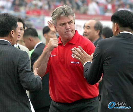 13일 인천 문학구장에서 열린 PSV 아인트호벤과 고려대 OB 프로올스타의 친선 경기에 앞서 히딩크 아인트호벤감독이 자신이 한국대표팀 시절 코치였던 정해성 부천 SK 감독(왼쪽)과 김현태 부천 SK 코치를 만나 복싱하는 포즈로 반가움을 표시하고 있다./인천=손용호 기자 spjj@osen.co.kr [Copyright ⓒ OSEN(www.osen.co.kr) 무단전재 및 재배포 금지]