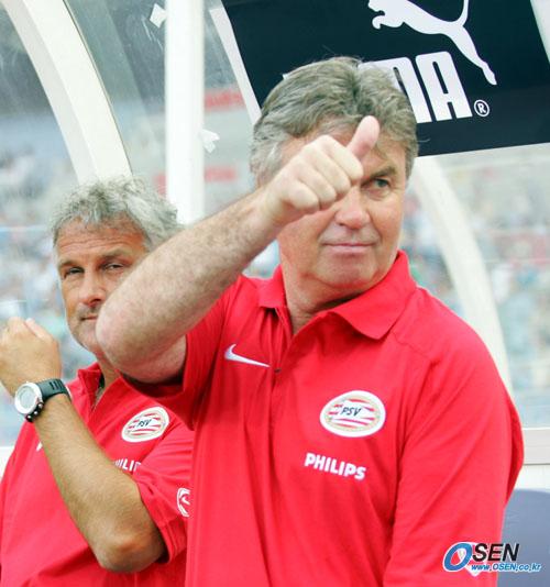 13일 인천 문학구장에서 열린 PSV 아인트호벤과 고려대 OB 프로올스타의 친선 경기가 시작되기 직전 히딩크 아인트호벤 감독이 벤치에서 엄지를 치켜들어 보이고 있다. /인천=주지영 기자 jj0jj0@osen.co.kr [Copyright ⓒ OSEN(www.osen.co.kr) 무단전재 및 재배포 금지]
