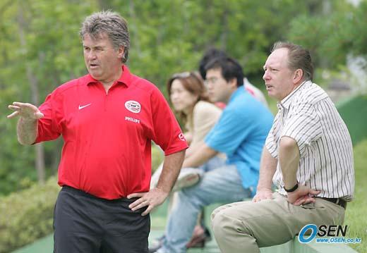본프레레 국가대표팀 감독이 피스컵 2005 코리아 대회에 출전하기 위해 내한한 PSV 아인트호벤의 히딩크 감독이 훈련하고 있는 파주 NFC를 14일 오전 방문, 대화를 나누고 있다. 두 감독은 같은 네덜란드 출신이자 올해 59세 동갑내기다. /파주=손용호 기자 spjj@osen.co.kr [Copyright ⓒ OSEN(www.osen.co.kr) 무단전재 및 재배포 금지]