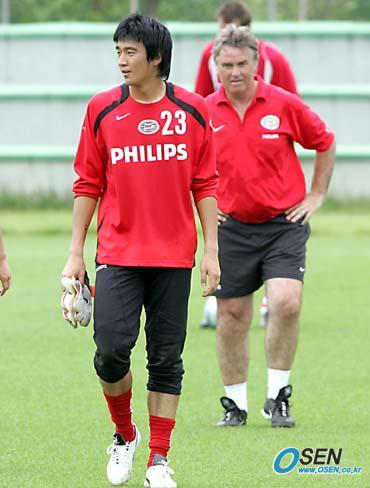 피스컵 2005 코리아 대회에 출전하기 위해 내한한 PSV 아인트호벤이 대회 개막전을 하루 앞두고 14일 파주 NFC에서 마무리 훈련을 가졌다. 히딩크 감독이 팀 훈련에 합류한 전남의 골키퍼 차기석을 뒤에서 쳐다보고 있다./파주=손용호 기자 spjj@osen.co [Copyright ⓒ OSEN(www.osen.co.kr) 무단전재 및 재배포 금지]