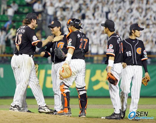 14일 LG 트윈스와 롯데 자이언츠의 잠실경기서 롯데가 5-4로 승리, LG를 6위로 끌어내고 5위로 전반기를 마감한 뒤 선수들이 하이파이브를 나누고 있다./잠실=주지영 기자 jj0jj0@osen.co.kr [Copyright ⓒ OSEN(www.osen.co.kr) 무단전재 및 재배포 금지]