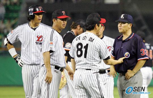 14일 LG 트윈스와 롯데 자이언츠의 잠실경기 LG의 9회말 1사 후 이병규의 유격수 땅볼 때 아웃이 선언되자 이순철 감독이 그라운드에 나와 박근영 1루심에게 항의하고 있다./잠실=주지영 기자 jj0jj0@osen.co.kr [Copyright ⓒ OSEN(www.osen.co.kr) 무단전재 및 재배포 금지]