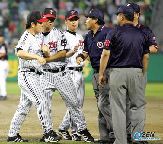 14일 LG 트윈스와 롯데 자이언츠의 잠실경기 4-5로 뒤지던 LG의 9회말 1사 후 이병규의 유격수 땅볼 때 박근영 1루심의 아웃 선언에 불만을 품은 이순철 감독(왼쪽)이 그라운드로 나와 항의하다 이를 제지하던 허운 구심(오른쪽에서 세 번째)과 약간의 몸싸움이 벌어지자 황병일 코치가 이 감독을 말리고 있다./잠실=주지영 기자 jj0jj0@osen.co.kr [Copyright ⓒ OSEN(www.osen.co.kr) 무단전재 및 재배포 금지]