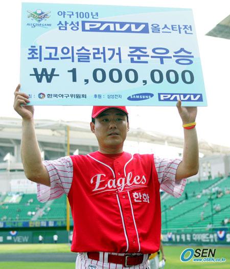 2005 삼성 PAVV 올스타 전야제가 15일 인천 문학구장에서 열렸다. 올스타 투수 최고의 슬러거를 뽑는 이벤트서 준우승을 차지한 한화의 문동환이 150만원의 상금판을 들어보이고 있다. /인천=주지영 기자 jj0jj0@osen.co.kr [Copyright ⓒ OSEN(www.osen.co.kr) 무단전재 및 재배포 금지]