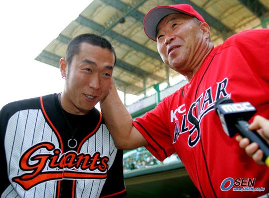 2005 삼성 PAVV 올스타 전야제가 15일 인천 문학구장에서 열렸다. 롯데의 정수근이 오랜만에 유니폼을 입고 KBO 올드스타 감독을 맡은 김응룡 삼성 사장에게 인사하자 김 사장이 정수근의 뒤통수를 쓰다듬고 있다./인천=주지영 기자 jj0jj0@osen.co.kr [Copyright ⓒ OSEN(www.osen.co.kr) 무단전재 및 재배포 금지]