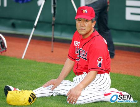 2005 삼성 PAVV 올스타 전야제가 15일 인천 문학구장에서 열렸다. 전야제의 하이라이트인 올드스타전에 앞서 프로 지도자들로 구성된 KBO(한국야구위원회) 올드스타의 유남호 기아 감독이 잔디에 앉아 유연한 자세로 스트레칭하고 있다. /인천=주지영 기자 jjojjo@osen.co.kr [Copyright ⓒ OSEN(www.osen.co.kr) 무단전재 및 재배포 금지]