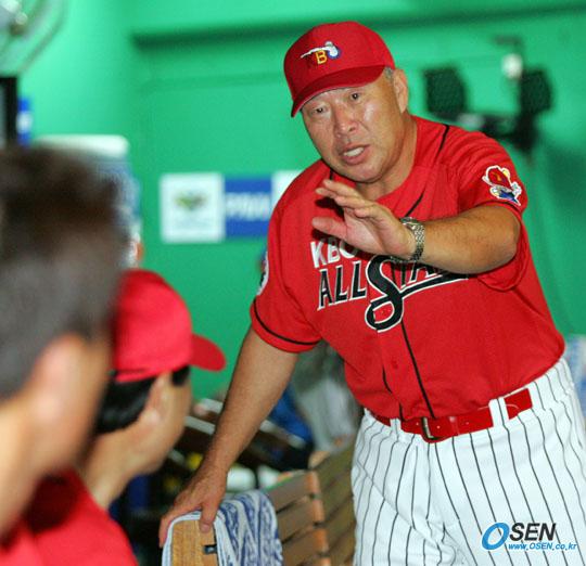 2005 삼성 PAVV 올스타 전야제가 15일 인천 문학구장에서 열렸다. 전야제의 하이라이트인 올드스타전에서 프로 지도자들로 구성된 KBO(한국야구위원회) 올스타 감독을 맡은 김응룡 삼성 사장이 덕아웃에서 후배들에게 뭔가 이야기하고 있다./인천=주지영 기자 jj0jj0@osen.co.kr [Copyright ⓒ OSEN(www.osen.co.kr) 무단전재 및 재배포 금지]