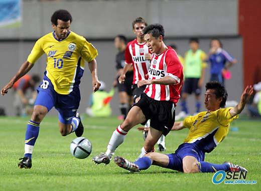 피스컵 2005 코리아 대회가 15일 서울 상암 월드컵경기장에서 성남 일화와 PSV 아인트호벤의 경기로 개막돼 아인트호벤이 성남에 2-1로 승리했다. 후반 아인트호벤의 이영표가 성남 두두와 김철호의 사이를 돌파하다 김철호의 태클에 걸려 넘어지고 있다./상암=손용호 기자 spjj@osen.co.kr [Copyright ⓒ OSEN(www.osen.co.kr) 무단전재 및 재배포 금지]