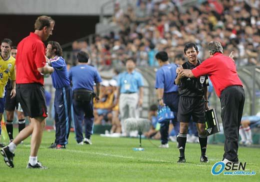 피스컵 2005 코리아 대회가 15일 서울 상암 월드컵경기장에서 성남 일화와 PSV 아인트호벤의 경기로 개막돼 아인트호벤이 성남에 2-1로 승리했다. 후반 아인트호벤의 트레이너가 주심의 허락을 받지 않고 경기장에 들어가 치료를 하고 나와 선심이 주의를 주려 하자 히딩크 감독이 말리고 있다./상암=손용호 기자 spjj@osen.co.kr [Copyright ⓒ OSEN(www.osen.co.kr) 무단전재 및 재배포 금지]