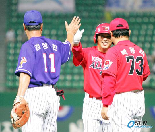 2005 삼성 PAVV 올스타 전야제가 15일 인천 문학구장에서 열렸다. 전야제의 하이라이트인 올드스타전에서 프로 지도자들로 구성된 KBO(한국야구위원회) 올스타의 박종훈 SK 코치가 1회말 1사 후 1루에 나간 뒤 상대편인 아마 지도자들의 KBA(대한야구협회) 올스타 1루수인 김성한 군산상고 감독과 하이파이브를 하고 있다. [Copyright ⓒ OSEN(www.osen.co.kr) 무단전재 및 재배포 금지]