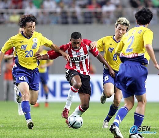 피스컵 2005 코리아 대회가 15일 서울 상암 월드컵경기장에서 성남 일화와 PSV 아인트호벤의 경기로 개막돼 아인트호벤이 성남에 2-1로 승리했다. 후반 아인트호벤의 호베르트가 성남 김영철(왼쪽)과 김두현 사이로 돌파를 시도하고 있다./상암=손용호 기자 spjj@osen.co.kr [Copyright ⓒ OSEN(www.osen.co.kr) 무단전재 및 재배포 금지]
