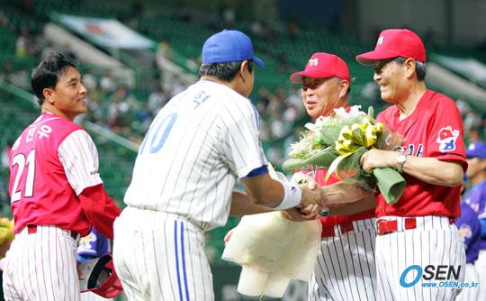 2005 삼성 PAVV 올스타 전야제가 15일 인천 문학구장에서 열렸다. 전야제의 하이라이트인 올드스타전에 앞서 프로 지도자들로 구성된 KBO(한국야구위원회) 올스타의 어우홍 명예 감독(오른쪽)과 김응룡 감독에게 현역 선수들을 대표해 각각 양준혁과 송진우가 꽃다발을 전달하고 있다. 어우홍 명예 감독은 82년 한국에 사상 유일한 세계선수권 우승을 안겼고 MBC와 롯데 감독을 역임했다. /인천=주지영 기자 jj0jj0@osen.co.kr [Copyright ⓒ OSEN(www.osen.co.kr) 무단전재 및 재배포 금지]